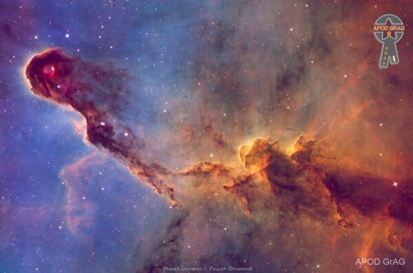 The elephant’s trunk stretches over about 20 light-years and houses at its summit two young stars that have cleared a small cavity.