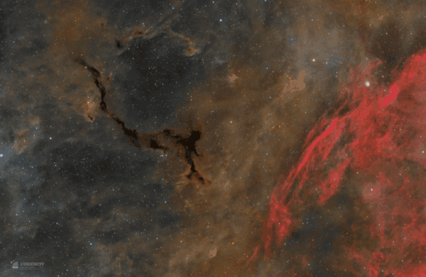 Spanning light-years, this suggestive shape known as the Seahorse Nebula floats in silhouette against a rich background of stars and glowing hydrogen gas. Seen toward the royal northern constellation of Cepheus, the dusty, dark nebula is part of a Milky Way molecular cloud some 1,200 light-years distant. It is also listed as Barnard 150 (B150), one of 182 dark markings of the sky cataloged in the early 20th century by astronomer E. E. Barnard. Packs of low mass stars are forming within, but their collapsing cores are only visible at long infrared wavelengths. Still, the luminous depths of the Milky Way in Cepheus add to this stunning galactic skyscape.