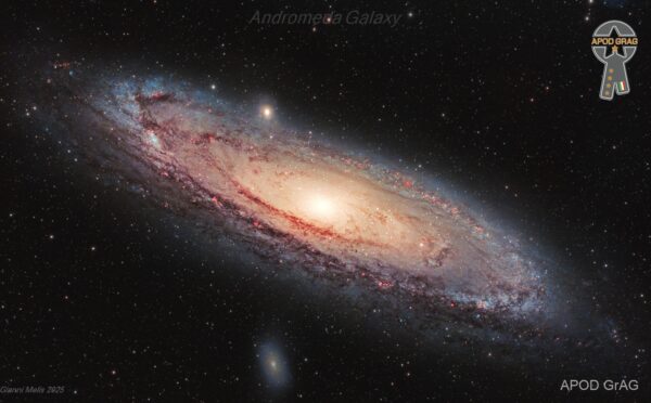 The Andromeda Galaxy is a barred spiral galaxy and is the nearest major galaxy to the Milky Way. It was originally named the Andromeda Nebula and is cataloged as Messier 31, M31, and NGC 224. Andromeda has a D25 isophotal diameter of about 46.56 kiloparsecs (152,000 light-years) and is approximately 765 kpc (2.5 million light-years) from Earth. The galaxy’s name stems from the area of Earth’s sky in which it appears, the constellation of Andromeda, which itself is named after the princess who was the wife of Perseus in Greek mythology.