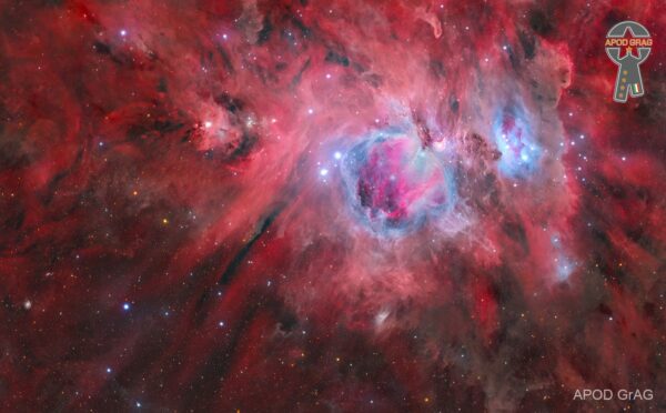 The Orion Nebula (also known as Messier 42, M42, or NGC 1976) is a diffuse nebulain the Milky Way situated south of Orion’s Belt in the constellation of Orion, and is known as the middle “star” in the “sword” of Orion. It is one of the brightest nebulaeand is visible to the naked eye in the night sky with an apparent magnitude of 4.0. It is 1,344 ± 20 light-years (412.1 ± 6.1 pc) away and is the closest region of massive star formation to Earth. M42 is estimated to be 25 light-years across (so its apparent size from Earth is approximately 1 degree). It has a mass of about 2,000 times that of the Sun. Older texts frequently refer to the Orion Nebula as the Great Nebula in Orion or the Great Orion Nebula.