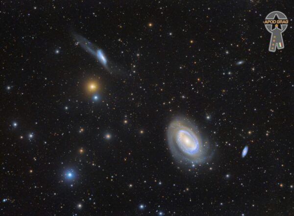 NGC 4725 is an intermediate barred spiral galaxy with a prominent ring structure, located in the northern constellation of Coma Berenices near the north galactic pole.[10] It was discovered by German-born British astronomer William Herschel on April 6, 1785. The galaxy lies at a distance of approximately 40 megalight-years from the Milky Way. NGC 4725 is the brightest member of the Coma I Group of the Coma-Sculptor Cloud, although it is relatively isolated from the other members of this group. This galaxy is strongly disturbed and is interacting with neighboring spiral galaxy NGC 4747, with its spiral arms showing indications of warping. The pair have an angular separation of 24′, which corresponds to a projected linear separation of 370 kly. A tidal plume extends from NGC 4747 toward NGC 4725.