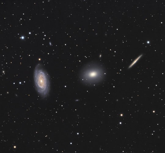 Unlike the Leo triplet however these galaxies are probably not related and reside at different distances so the triplet is purely a line of sight effect. NGC 5985 is about 120 million light years away, NGC 5982 about 130 million years and the small edge on NGC 5981 about 100 million light years away. However given the errors in astronomical distance measurement they could still be related.