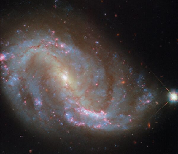 [Image Description: A spiral galaxy featuring a bright, glowing core that is crossed by a horizontal bar of yellowish light. Spiral arms emerge from each end of this bar and wrap around it, creating a disc that is stretched out to the right. Some areas, mostly along the arms, glow pink where stars are forming in nebulae. Webs of dark reddish dust also follow the arms. A star in our galaxy shines prominently, off to the right.]