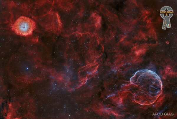 NGC 7822 is a young star forming complex in the constellation of Cepheus. The complex encompasses the emission region designated Sharpless 171, and the young cluster of stars named Berkeley 59. The complex is believed to be some 800–1000 pc distant, with the younger components aged no more than a few million years. The complex also includes one of the hottest stars discovered within 1 kpc of the Sun, namely BD+66 1673, which is an eclipsing binary system consisting of an O5V that exhibits a surface temperature of nearly 45,000 K and a luminosity about 100,000 times that of the Sun. The star is one of the primary sources illuminating the nebula and shaping the complex’s famed pillars of creation-type formations, the elephant trunks.