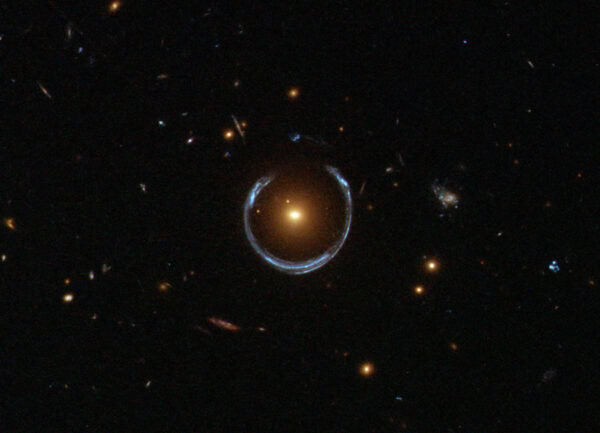 A gravitational lens mirage. Pictured here, the gravity of a massive elliptical galaxy (luminous red galaxy: LRG) has gravitationally distorted the light from a much more distant blue galaxy. More typically, such light bending results in two discernible images of the distant galaxy, but here the lens alignment is so precise that the background galaxy is distorted into a horseshoe — a nearly complete ring: an Einstein ring. Although LRG 3-757 was discovered in 2007 in data from the Sloan Digital Sky Survey (SDSS), the image shown above is a follow-up observation taken with the Hubble Space Telescope‘s Wide Field Camera 3. A recent lens analysis of the central galaxy indicates that it likely hosts the single most massive black hole yet discovered: 36 billion times the mass of our Sun.